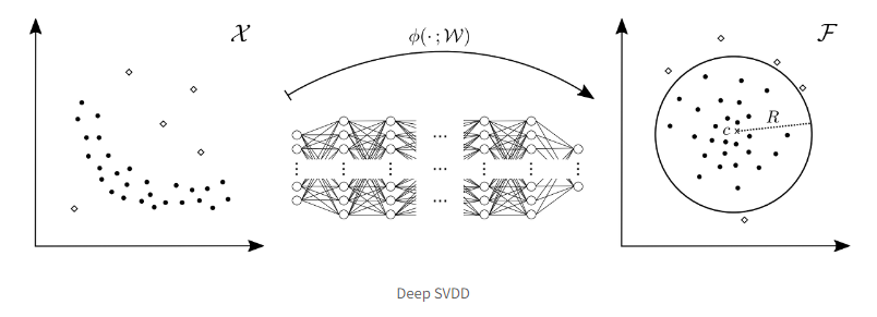 - 기존 데이터 Point들의 Feature space에서 정상 데이터를 둘러싸는 Hypersphere(초구, Boundary)를 찾고, 해당 Boundary를 기준으로 이상치를 탐지