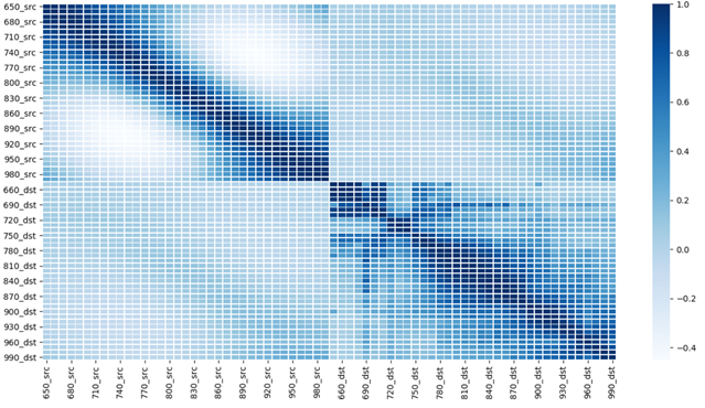 sns.heatmap(data = tr_y.corr(), annot=False, fmt = '.2f', linewidths=.5, cmap='Blues')