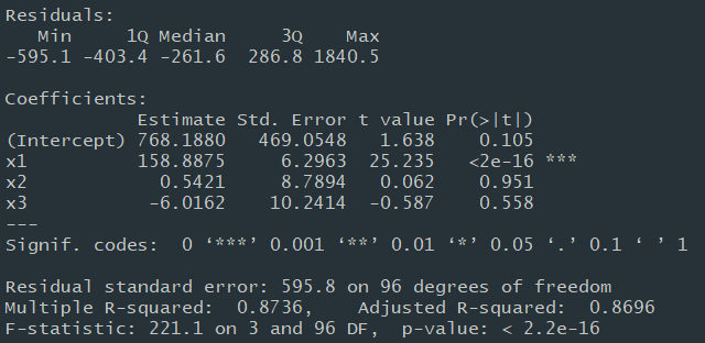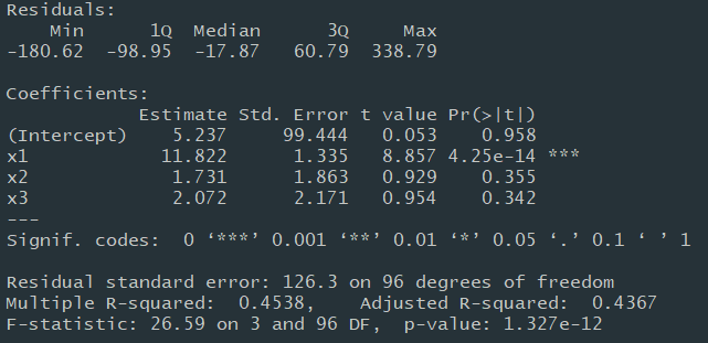 reg1 = lm(y1~x1+x2+x3); summary(reg1)