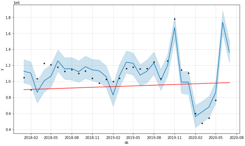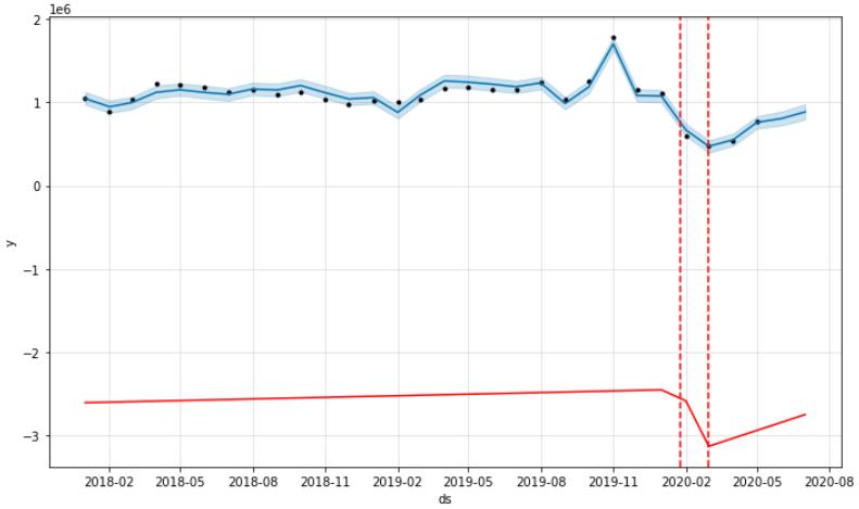 plot을 그려서 예측 결과를 보면, 코로나 이후에 감소한 효과가 6월/7월에는 보이지 않습니다.